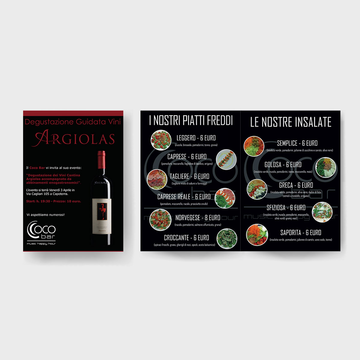 Il Coco Bar è un elegante bar lounge bar. Abbiamo curato per loro tutto ciò che riguarda la pubblicità cartacea (biglietti da visita, roll up, adesivi, menù). Per le serate a tema degustazione, ci siamo occupati della realizzazione delle locandine promozionali e la loro pubblicazione sui vari social media.