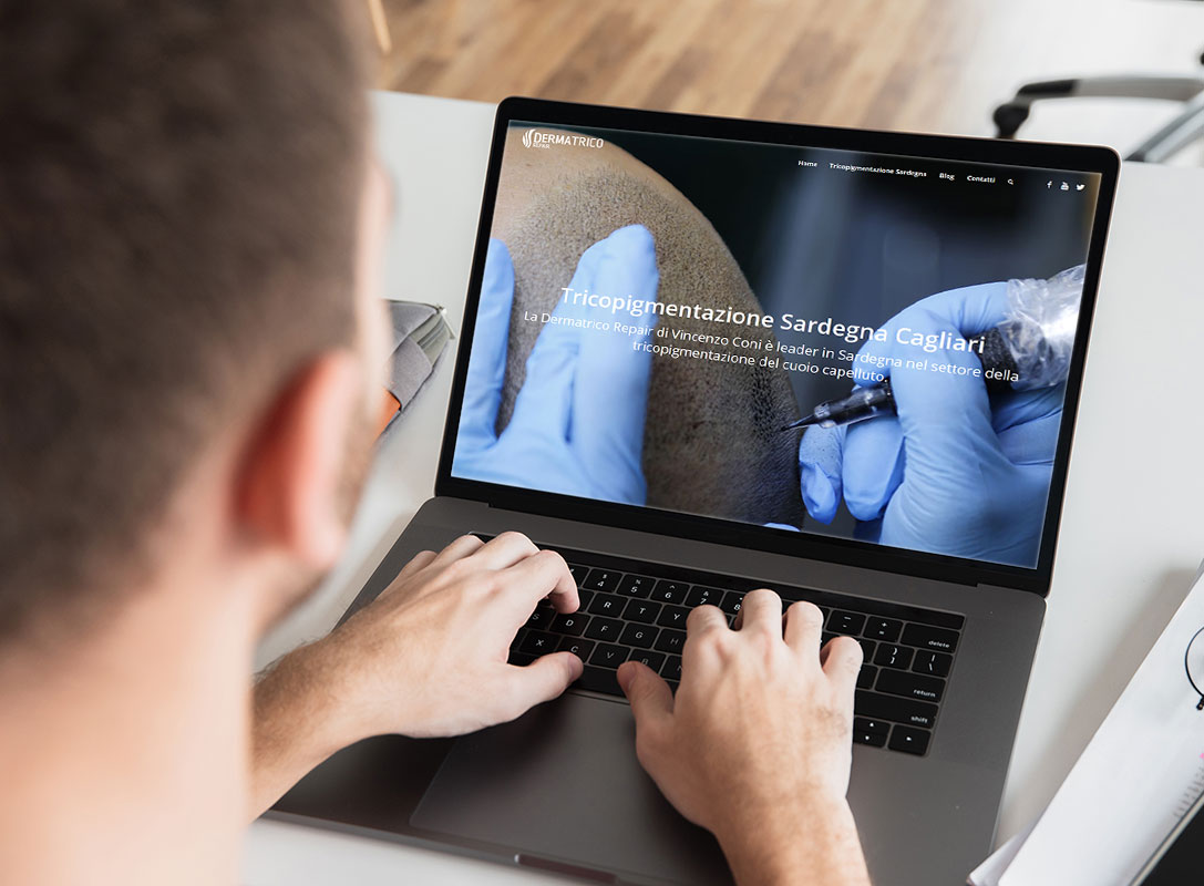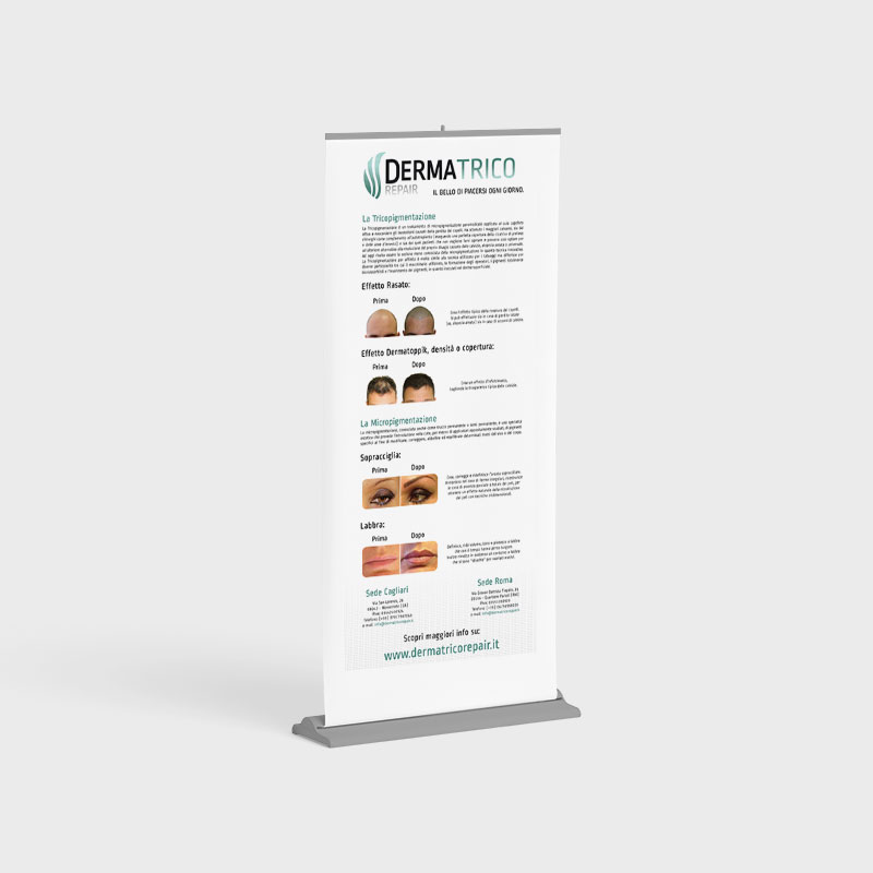 La Dermatrico Repair di Vincenzo Coni è leader in Sardegna nel settore della tricopigmentazione del cuoio capelluto. La sua tecnica è esclusiva, per questo è presente come ospite nelle maggiori fiere del settore in tutto il mondo. Ci ha commissionato dei Roll Up e del materiale pubblicitario da esporre nelle varie manifestazioni. Abbiamo realizzato per lui il sito web aziendale, dove vengono spiegate le varie tecniche utilizzate e le foto dei pazienti che si sono sottoposti a questo trattamento. Il sito risulta in prima pagina su Google per le maggiori keywords di riferimento del settore.